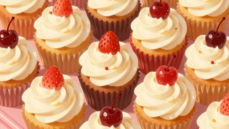 A close-up of cupcakes with creamy white frosting, glossy cherries, and strawberries, illuminated by diffused, warm light that highlights the texture and glossy finish. The soft pink background enhances the focus on the cupcakes, creating a shallow depth of field.