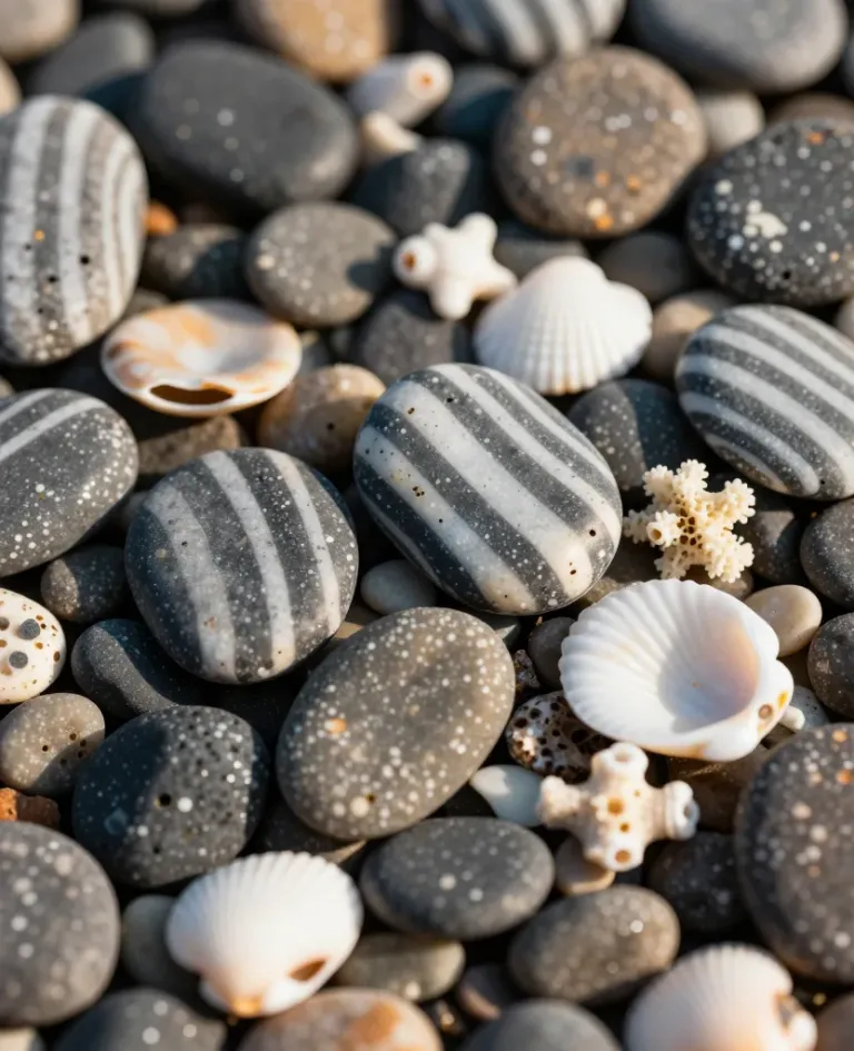 Smooth, glossy pebbles with white speckles and black stripes are highlighted by diffused sunlight, creating soft highlights and subtle shadows, enhancing the textures. The close-up, detailed view emphasizes the intricate patterns and shapes of the pebbles and shells against a blurred background.