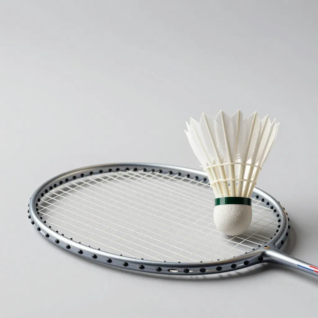 A badminton racket with a shuttlecock delicately balanced on its taut strings, showcasing the smooth polished metal frame and soft translucent feathers under soft directional lighting. The shallow depth of field and seamless light gray background emphasize the subject’s clean lines and minimalistic composition.
