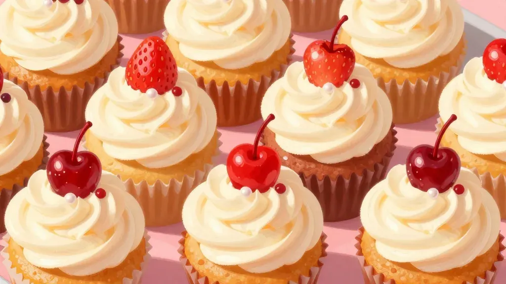 A grid of cupcakes with creamy frosting and cherries, softly lit from above, creating gentle highlights on the frosting and cherries. The soft pink background provides a clean and simple backdrop, keeping the focus on the cupcakes.