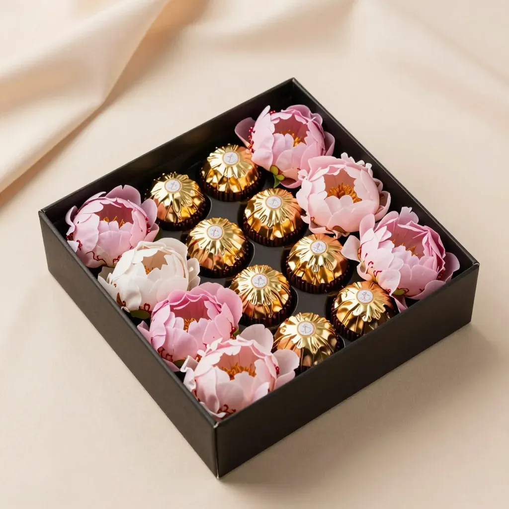 A square box filled with chocolates wrapped in glossy gold foil and adorned with delicate pink peony flowers, set against a soft, diffused, ambient light that highlights the textures and colors. The neutral beige background and shallow depth of field emphasize the chocolates and flowers, making it ideal for product photography and gift packaging design.