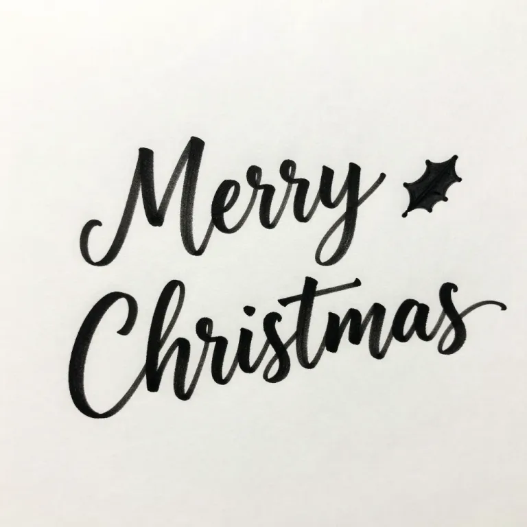 A hand-drawn 'Merry Christmas' script with a holly leaf, rendered in smooth, glossy black ink on a white background, illuminated by soft, diffused light that creates gentle shadows, providing ample copy space for design integration.