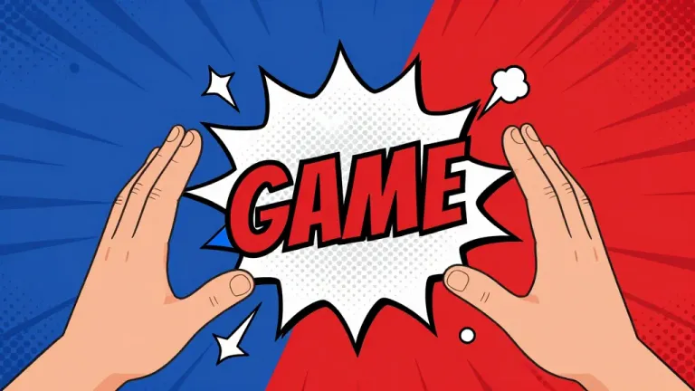 Two cartoon-style hands push against a white comic burst containing the word 'GAME', set against a diagonally split red and blue background with radiating lines. The flat, high-contrast pop art lighting and halftone dot texture create a dynamic, vintage comic book aesthetic with strong visual tension and symmetrical framing.
