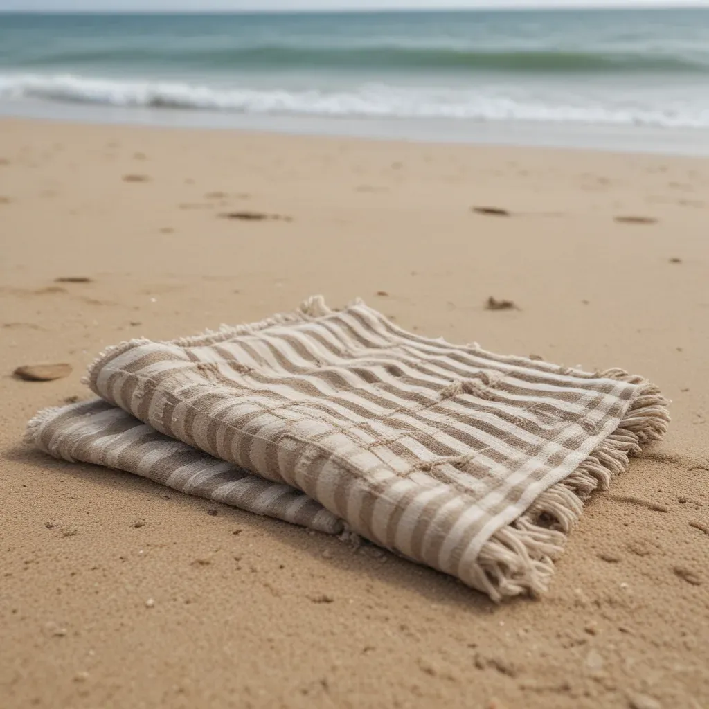 A neatly folded beach towel with fringed edges rests on a sandy beach, bathed in soft, diffused light that enhances the warm, golden hue of the sand and the deep blue of the ocean. The shallow depth of field draws attention to the towel, while the blurred background of gentle ocean waves adds a serene, tranquil atmosphere.