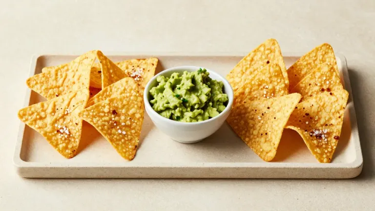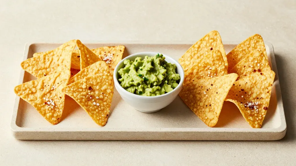 A circular arrangement of crispy sesame-seeded tortilla chips surrounding a creamy guacamole bowl, highlighted by warm, diffused lighting that accentuates the textures and vibrant colors, set against a neutral beige background with a shallow depth of field.