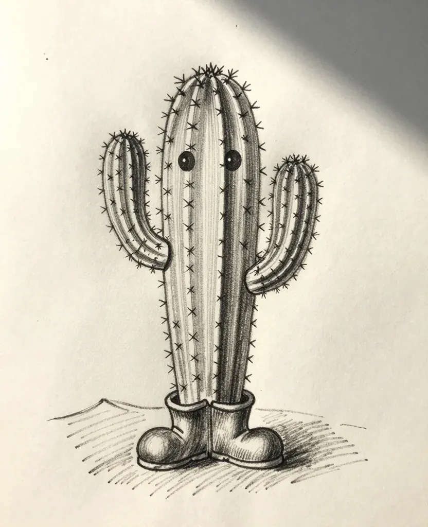 A whimsical anthropomorphic cactus with a face and boots, rendered in black and white with soft, diffused lighting and minimal background, creating a clean and focused composition.