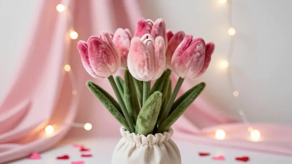 A soft, velvety plush tulip bouquet in a smooth ceramic vase, bathed in diffused light that creates gentle shadows and highlights, set against a soft pink fabric backdrop with scattered petals. The shallow depth of field draws attention to the bouquet, making it ideal for product photography and interior design inspiration.