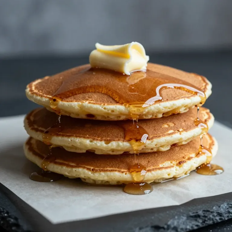 A stack of fluffy golden pancakes is drizzled with glossy syrup and topped with a pat of creamy butter, creating a visually appealing and appetizing scene. The soft, diffused lighting highlights the textures of the pancakes and the syrup, while the neutral gray background ensures the focus remains on the delicious breakfast dish.