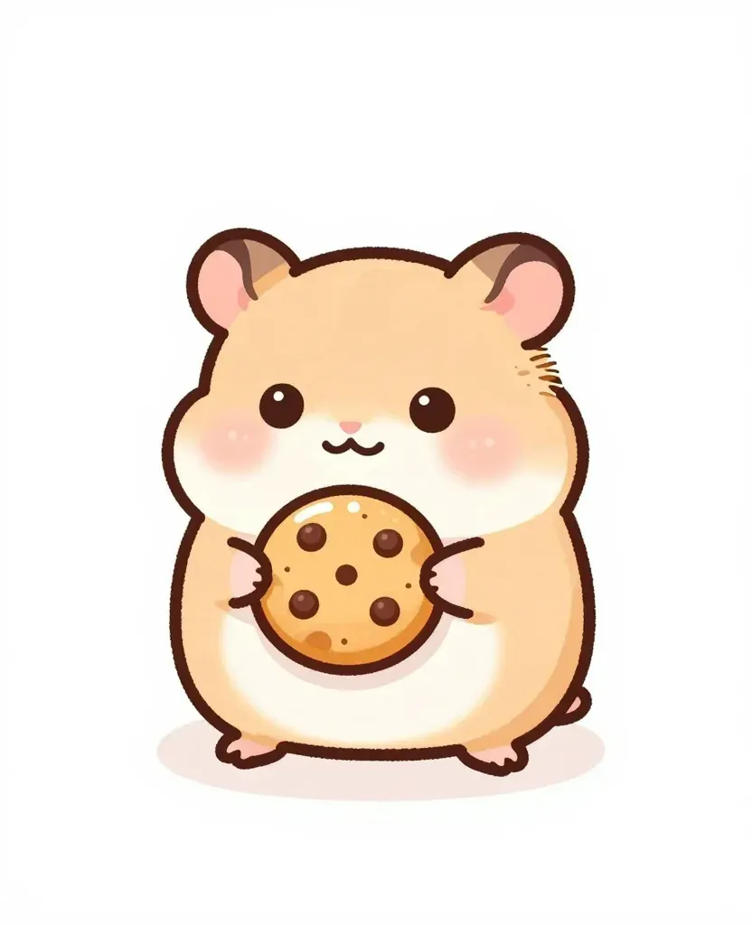 A soft, fluffy hamster holds a glossy chocolate chip cookie, with gentle shadows enhancing its features and the cookie's texture. The plain, light-colored background ensures the focus remains on the subject, creating a balanced and engaging composition.