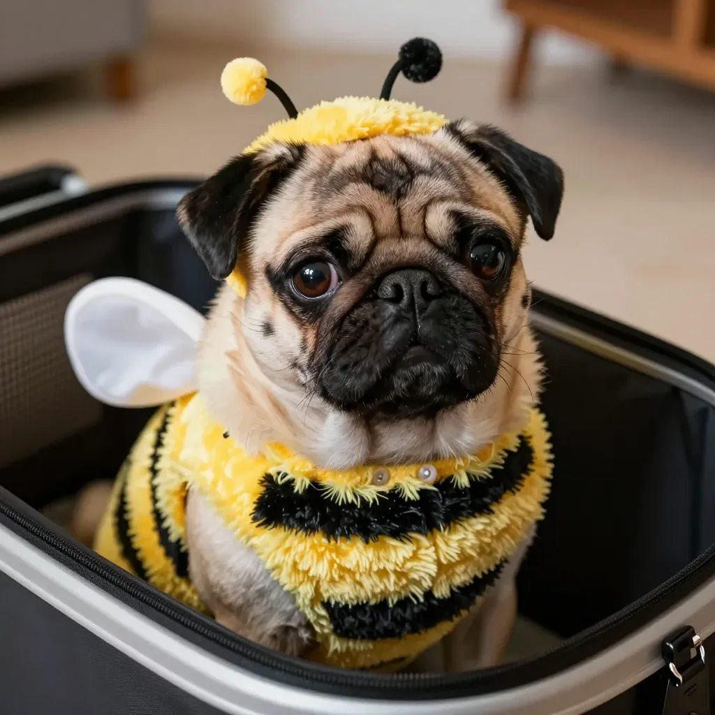 A pug dressed in a fuzzy bee costume sits in an open suitcase, with soft, even lighting highlighting the subject's features and costume. The blurred background suggests a domestic setting with a light-colored floor and furniture, providing a shallow depth of field.