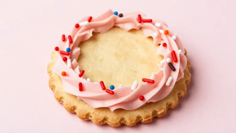 A close-up of a golden-brown shortbread cookie adorned with glossy pink frosting and colorful sprinkles, illuminated by diffused, soft light that highlights the texture and vibrant colors. The shallow depth of field and blurred pink background emphasize the subject, creating a clean and simple backdrop.