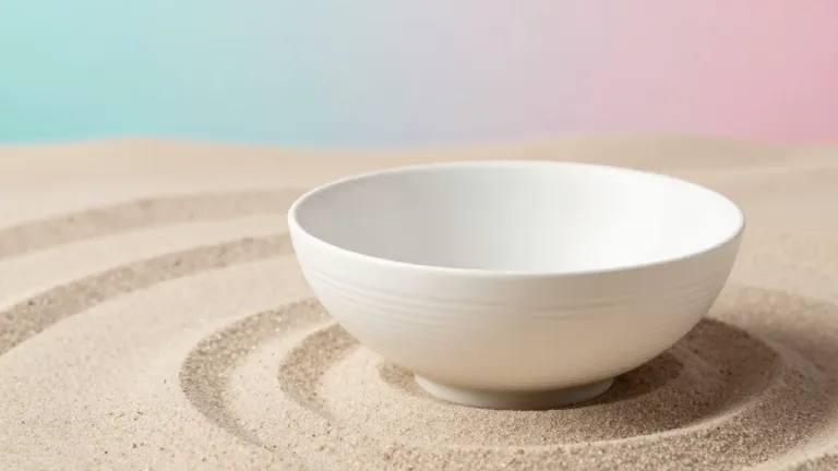 A matte white ceramic bowl with subtle horizontal ridges rests empty on finely raked sand, creating concentric circles that draw focus to the center. Soft diffused lighting from above highlights the bowl's rim and casts a gentle shadow, while the shallow depth of field blurs the pastel gradient backdrop, enhancing the minimalist composition.
