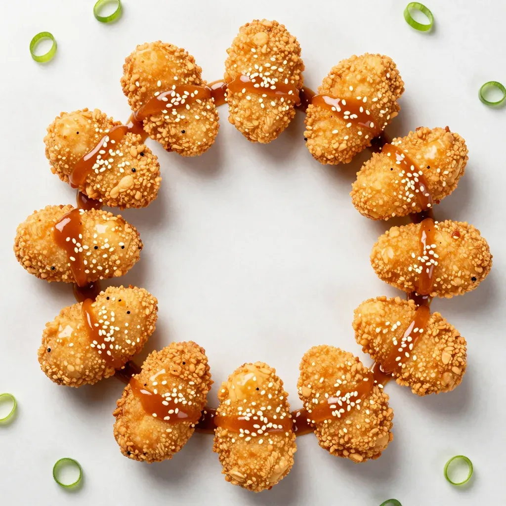 Golden-brown, crispy chicken nuggets coated in sesame seeds are arranged in a circular ring and drizzled with a glossy amber-orange sauce, creating a lustrous sheen on the surface. The top-down perspective with shallow depth of field and bright diffused lighting emphasizes the textures and colors against a clean off-white background with scattered green onion rings.