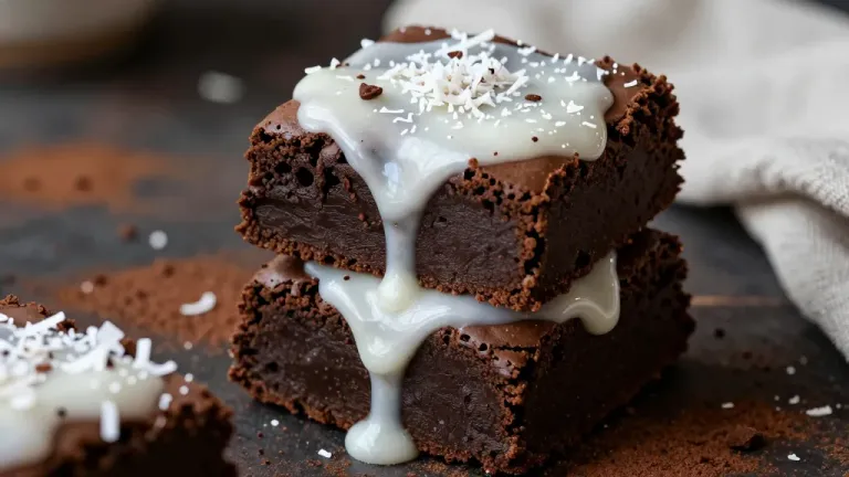 A close-up of glossy chocolate brownies topped with creamy icing and crunchy coconut flakes, softly lit to highlight the textures and creamy surface. The shallow depth of field and blurred neutral background emphasize the rich, indulgent dessert.