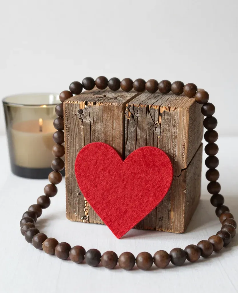 A rustic reclaimed wood block adorned with a vibrant red heart and a string of dark wooden beads, set against a soft, diffused light from a candle, creating gentle shadows and highlights. The clean white background provides a stark contrast, emphasizing the textures and colors of the subject.