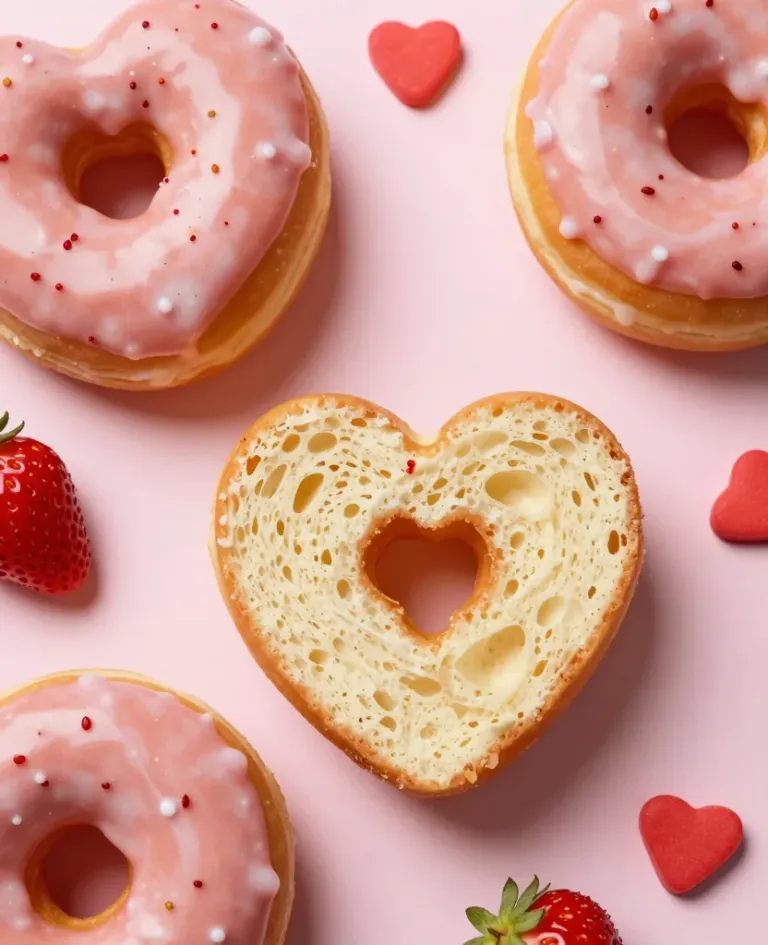 A heart-shaped donut with a smooth, glossy pink glaze and golden interior, surrounded by smaller donuts and strawberries, under soft, diffused lighting that creates gentle highlights and shadows, emphasizing the donuts and strawberries against a blurred, soft pink background.