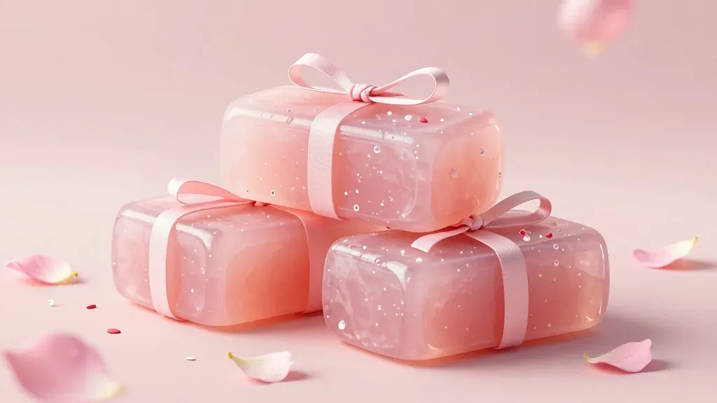Stacked iridescent soap bars with pink ribbons and subtle glitter, softly lit from above, creating a warm glow and gentle highlights. The blurred pink backdrop enhances focus on the soap bars and scattered petals, offering a clean and elegant composition.
