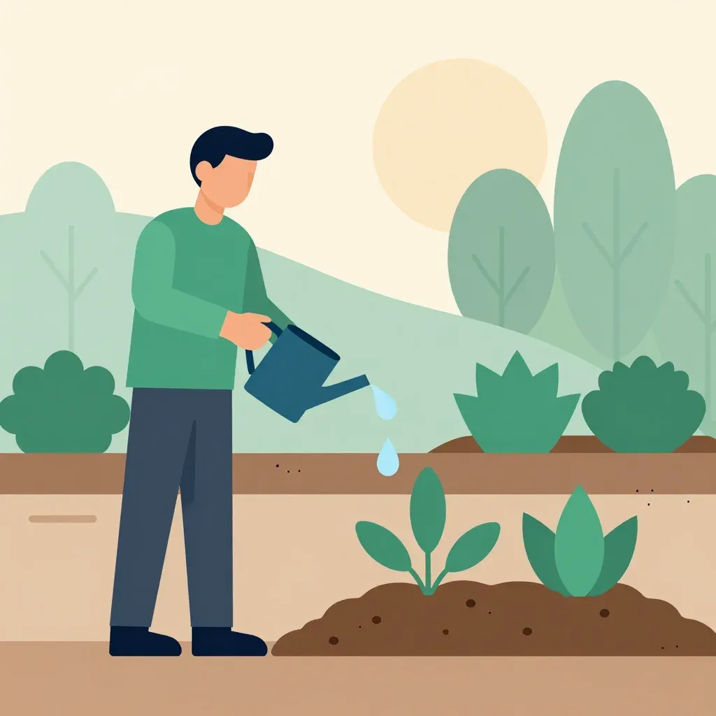 A man carefully waters young plants with a blue watering can, set against a soft, golden-lit background of trees and bushes. The warm sunlight highlights the glossy green leaves and rich brown soil, creating a serene and natural setting.