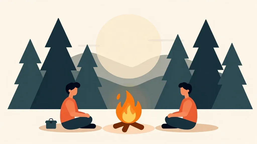 Two individuals sit in a warm, soft campfire circle, surrounded by glossy, cool forest greens. The warm firelight highlights their relaxed postures, creating a serene and inviting atmosphere. The slightly blurred background emphasizes the subjects and the fire, offering a clean and focused composition.
