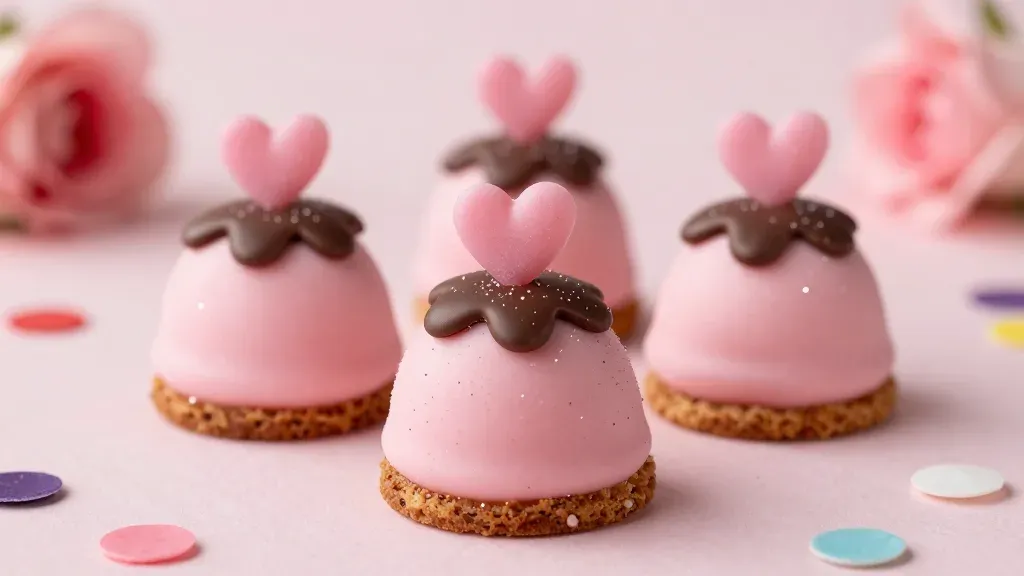 Close-up of petit fours adorned with glossy pink hearts, set against a soft, diffused light that highlights the texture and color of the treats. The shallow depth of field and pastel background create a delicate, festive atmosphere.