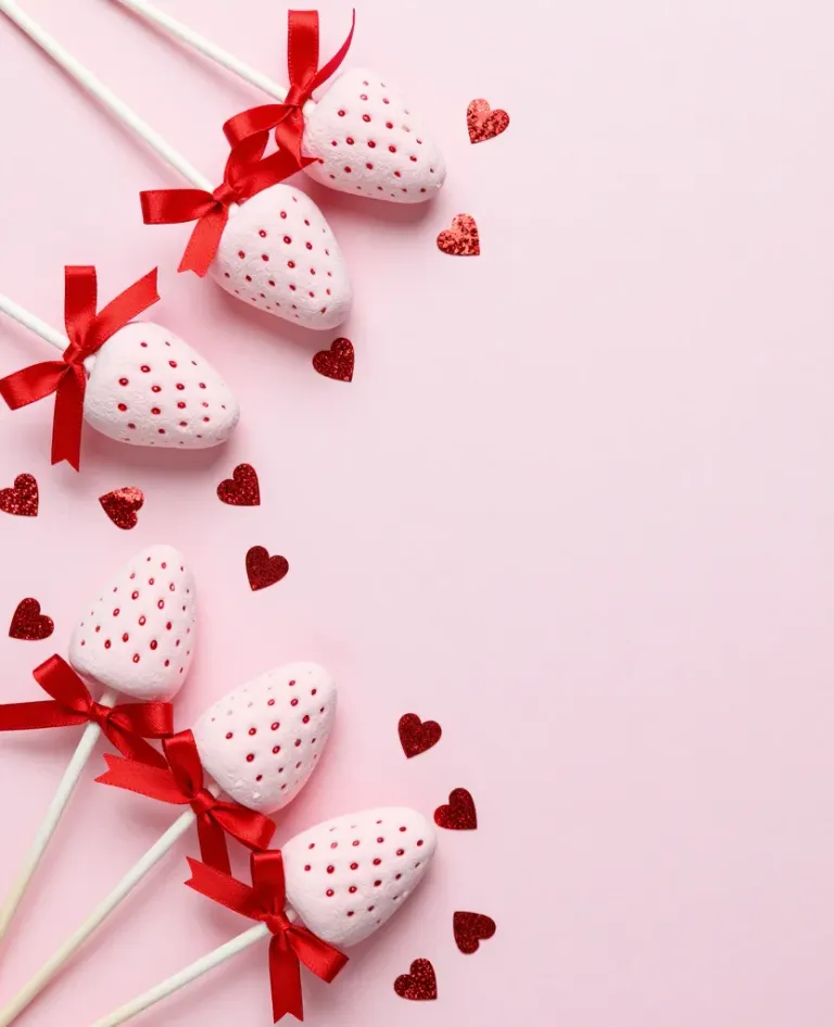 Close-up of glossy, white marshmallow pops shaped like strawberries, adorned with shiny red ribbons and scattered red hearts, set against a soft pink background. The diffused lighting highlights the texture and creates a romantic, festive atmosphere with ample copy space for design elements.