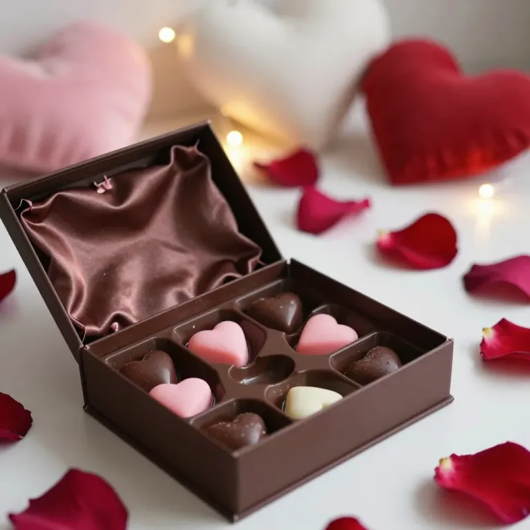 An open chocolate box reveals glossy heart-shaped and round chocolates nestled in a satin-lined interior, surrounded by delicate rose petals with softly curled edges. Warm, diffused lighting from out-of-focus fairy lights creates a shallow depth of field and gentle highlights on the chocolates and satin, set against a blurred background with romantic heart-shaped objects.