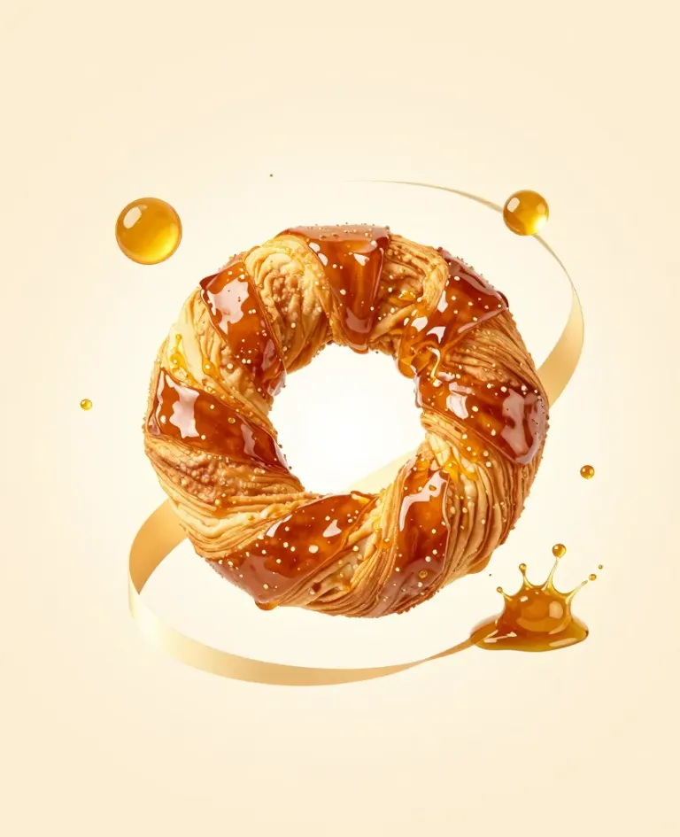 A flaky pastry coated in a glossy amber honey glaze, softly lit from above to highlight its texture and sheen. The neutral beige background ensures the cruller remains the focal point, with a shallow depth of field enhancing its visual appeal.