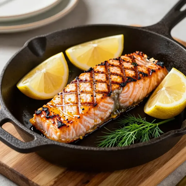 A glossy, slightly charred grilled salmon fillet rests in a cast iron skillet, surrounded by bright lemon slices and fresh dill, bathed in warm, soft directional light. The shallow depth of field and centered composition emphasize the vibrant colors and textures, making it ideal for culinary and food photography.