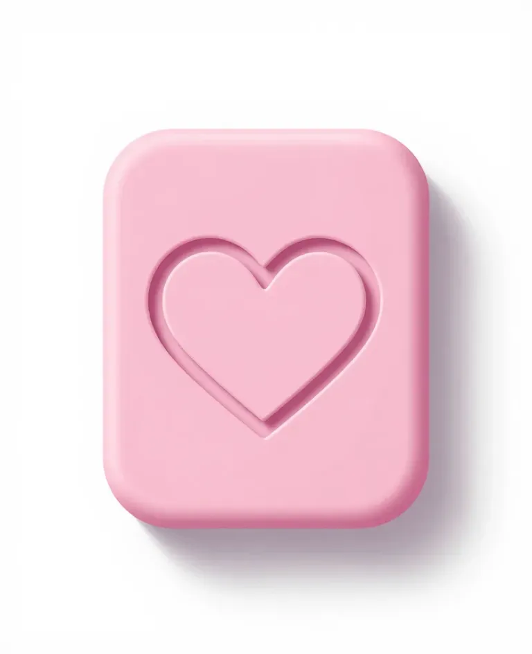 A smooth, glossy pink soap bar with a heart-shaped cutout, softly lit from above, creating subtle highlights and shadows. The clean, white background emphasizes the soap's simplicity and elegance.