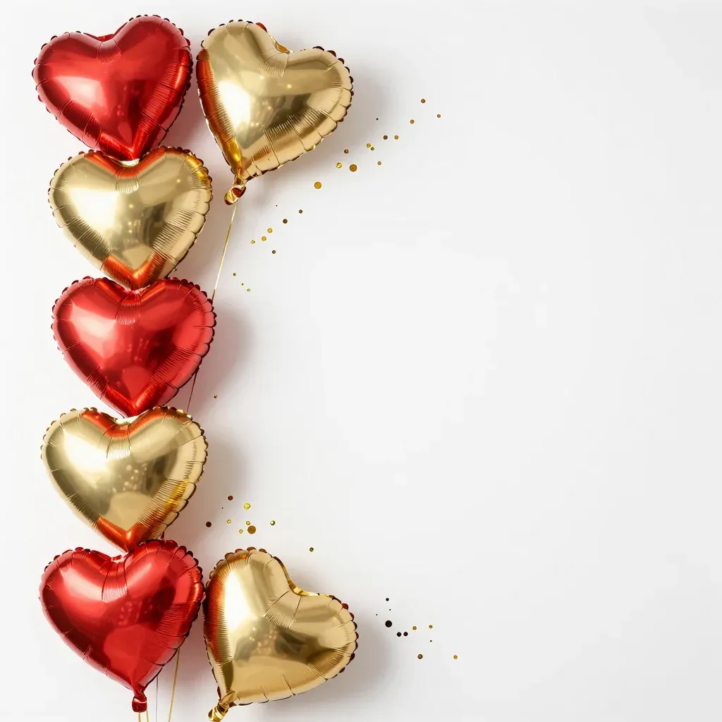 A vertical arrangement of glossy, reflective red and gold heart-shaped balloons, softly lit to highlight their surfaces, against a clean, white background that emphasizes the balloons and provides ample copy space.