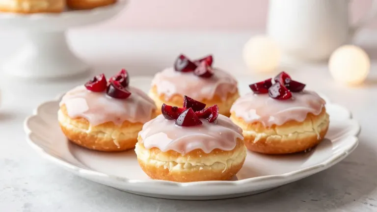 Golden-brown donuts with glossy pink glaze and fresh cherry slices are artfully arranged on a white plate, illuminated by soft, diffused light that highlights the textures and vibrant colors, creating a cozy and inviting atmosphere.