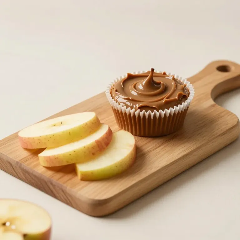 A caramel cupcake with glossy sauce and crisp apple slices arranged on a wooden cutting board, illuminated by soft, diffused light that highlights the textures and colors, creating a harmonious and appetizing composition.