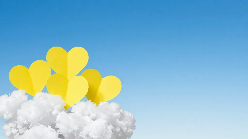 Glossy yellow hearts gently hover above fluffy white clouds against a soft blue sky, creating a serene and harmonious composition. The diffused lighting highlights the hearts and casts subtle shadows on the clouds, enhancing the three-dimensional effect and adding depth to the image.
