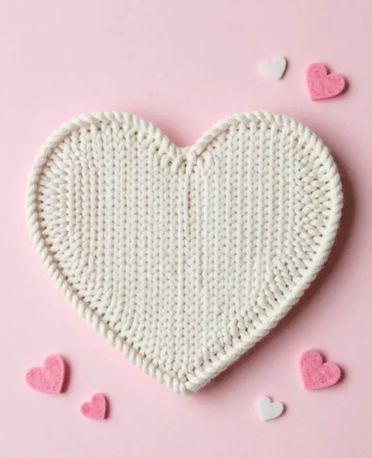 A white knit heart-shaped coaster with a dense pattern sits centered against a soft pink background, surrounded by scattered pink hearts, creating a balanced and inviting composition. The soft, diffused lighting highlights the texture and creates gentle shadows, enhancing the cozy and romantic mood.