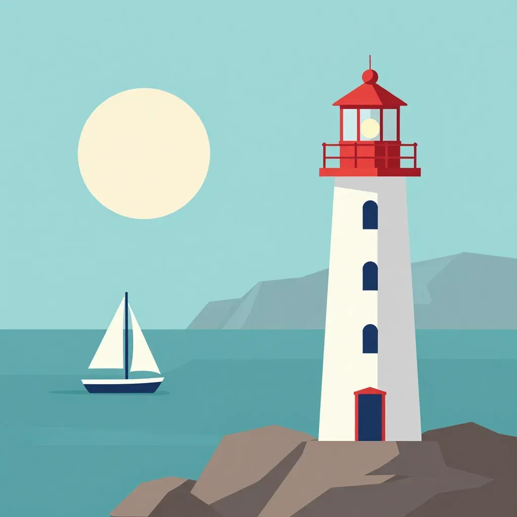 A glossy red and white lighthouse stands prominently in the foreground, casting gentle shadows on the rocky shoreline, while a sailboat glides smoothly across the calm, reflective water. The soft, diffused sunlight enhances the tranquil atmosphere of the harbor, with distant hills providing a serene backdrop.