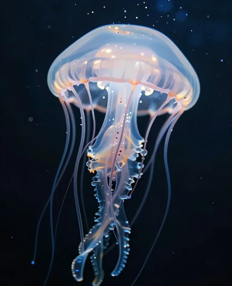 A translucent jellyfish with glowing tentacles gently drifts against a dark, out-of-focus background, creating a mesmerizing and ethereal glow. The soft, ambient light from within the jellyfish highlights its delicate, frilly tentacles and smooth, slippery texture, emphasizing its otherworldly beauty.