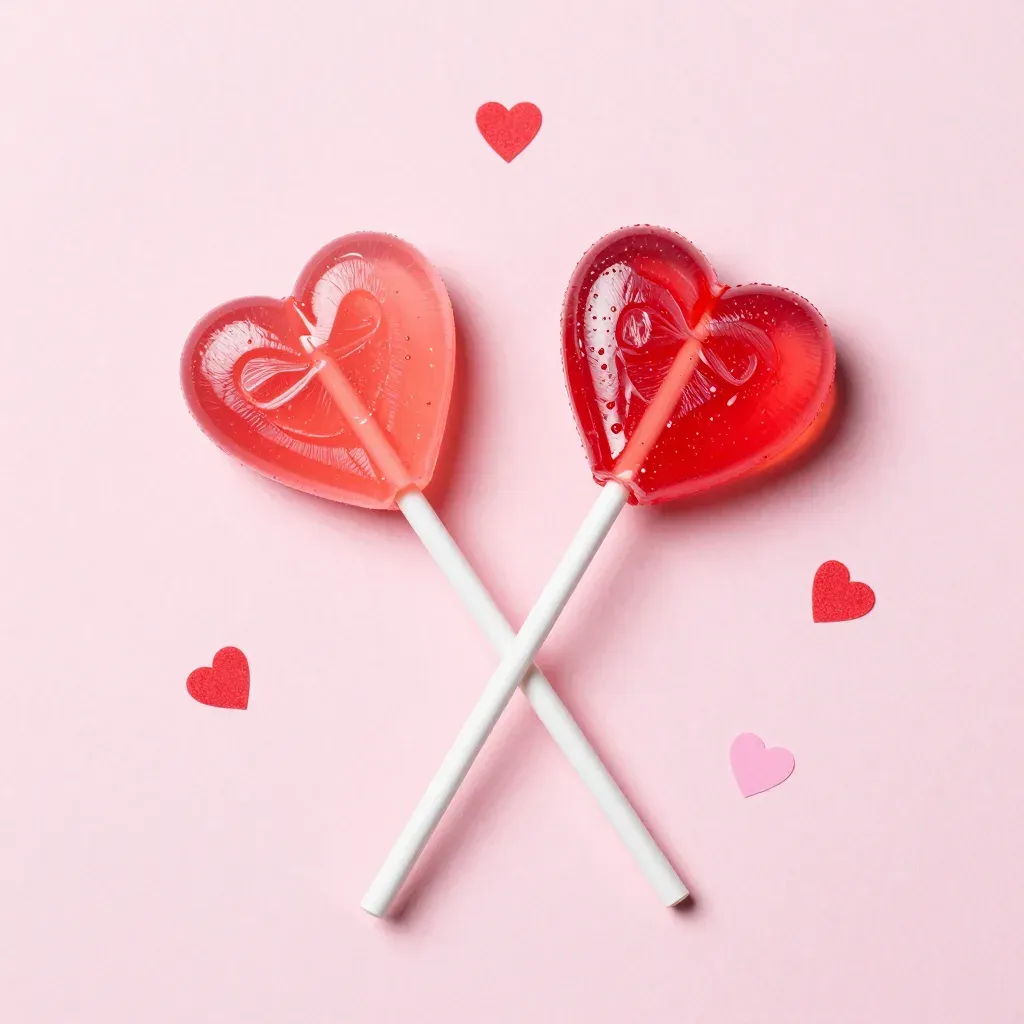 Translucent red heart-shaped lollipops with glossy surfaces and white sticks, softly lit from above, creating gentle shadows and highlights, set against a solid soft pink background with scattered red hearts, adding depth and a playful element.