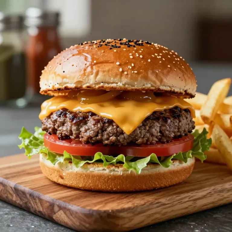 A close-up of a beef burger with melted cheese, tomato, lettuce, and sesame seed bun, served with golden fries on a wooden board. Soft directional lighting from the upper left highlights the glossy cheese and toasted bun, while shallow depth of field isolates the subject against a blurred kitchen background.
