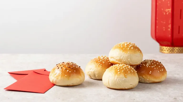 Golden-brown pretzels with sesame seeds are arranged casually on a light surface, highlighted by soft, diffused lighting that emphasizes their texture. The red accents from paper and a decorative lantern add depth and context to the composition.
