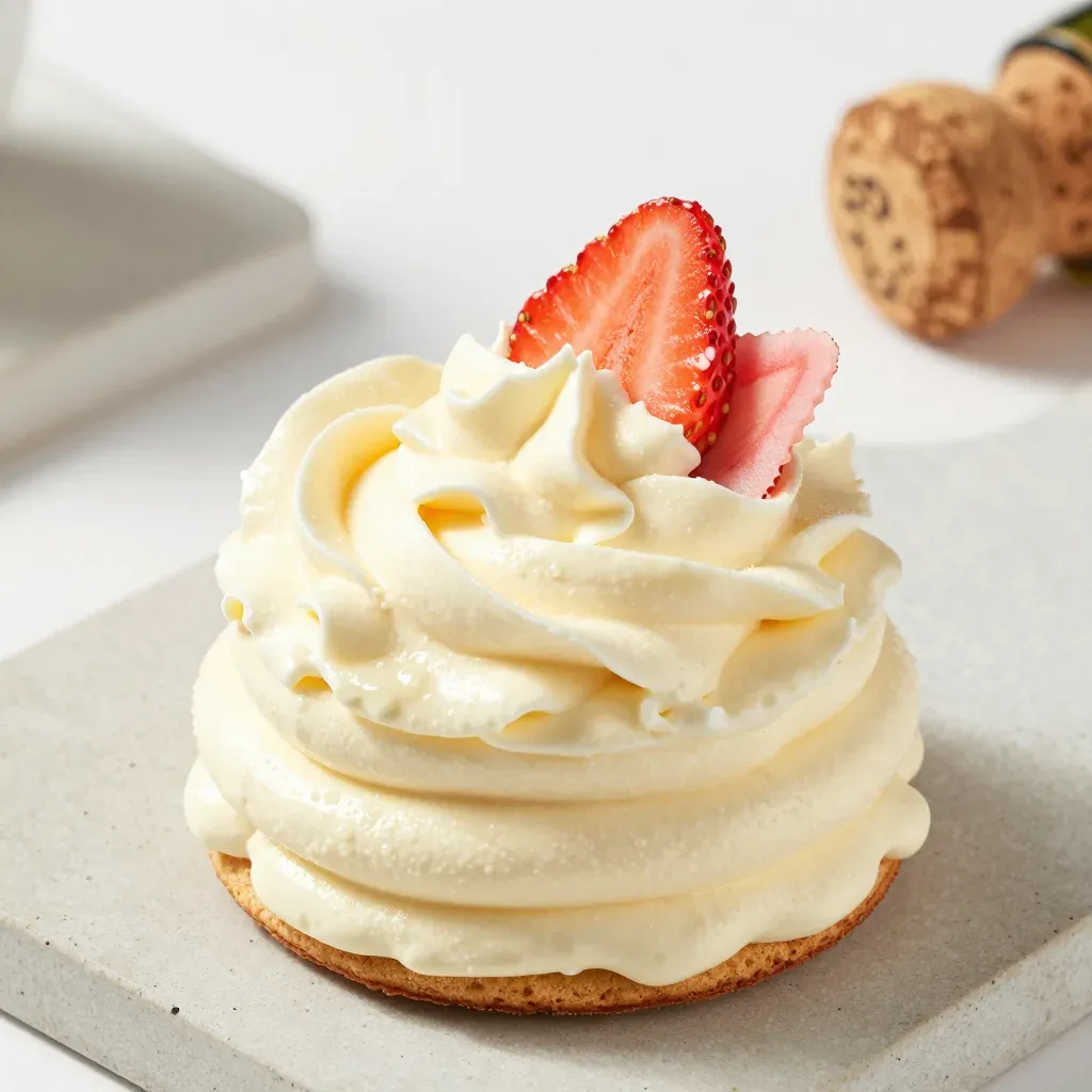 A close-up of a creamy whipped cream swirl on a golden-brown cookie, topped with a vibrant red strawberry slice, highlighted by soft, diffused lighting that accentuates the texture and juiciness of the strawberry. The shallow depth of field and clean background provide a minimalist and elegant backdrop.