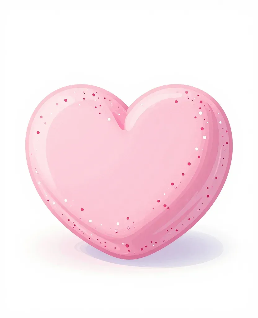 A glossy, translucent pink heart-shaped marshmallow with white speckles, highlighted by direct overhead lighting, creating a shallow depth of field against a pure white background. The clean, uncluttered composition and soft focus emphasize the marshmallow's delicate texture and vibrant color.