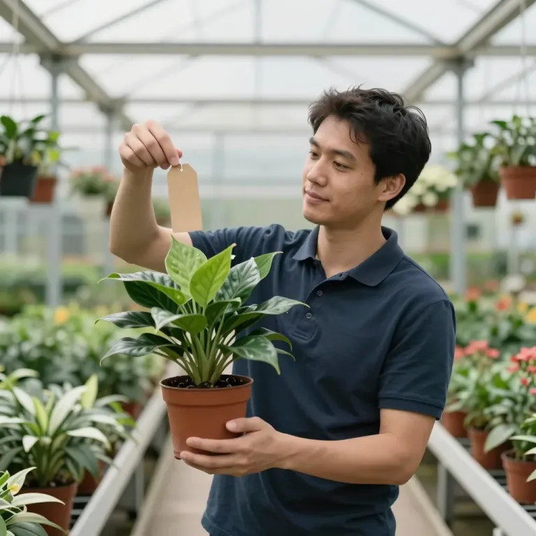 A young man carefully examines a tag on a potted plant in a greenhouse, with soft, diffused lighting highlighting the glossy leaves and smooth tag. The blurred background of various plants and flowers adds depth to the image, emphasizing the subject.