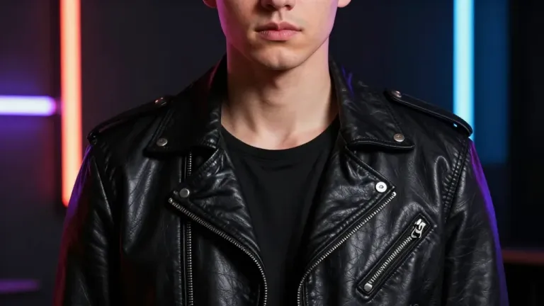 A person in a black leather jacket stands against a neon-lit urban backdrop, with ambient lighting casting highlights and shadows. The close-up shot emphasizes the texture of the glossy, scuffed leather and the vibrant neon colors in the background.