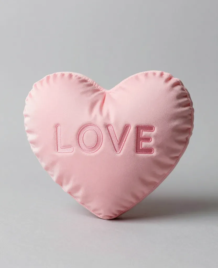 A soft, velvety pink heart-shaped cushion with the word 'LOVE' embroidered on it, illuminated by diffused light that creates gentle highlights and shadows, emphasizing the cushion's texture and depth. The light gray background ensures the cushion stands out as the focal point with ample copy space.