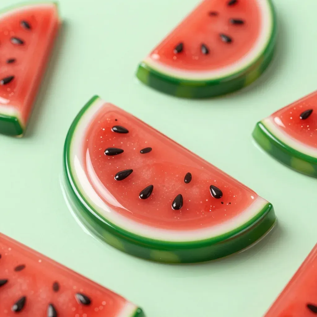 Close-up of glossy, translucent watermelon slices with vibrant red flesh, crisp green rind, and black seeds, highlighted by diffused, soft lighting. The uniform mint green background slightly blurs to emphasize the watermelon slices, creating a clean and focused composition.