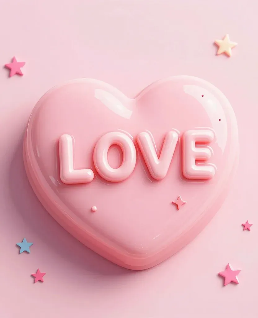 A translucent heart with the word 'LOVE' embossed in the center, illuminated by soft, diffused light that creates highlights and reflections, set against a soft pink background with scattered stars, creating a balanced and symmetrical composition.
