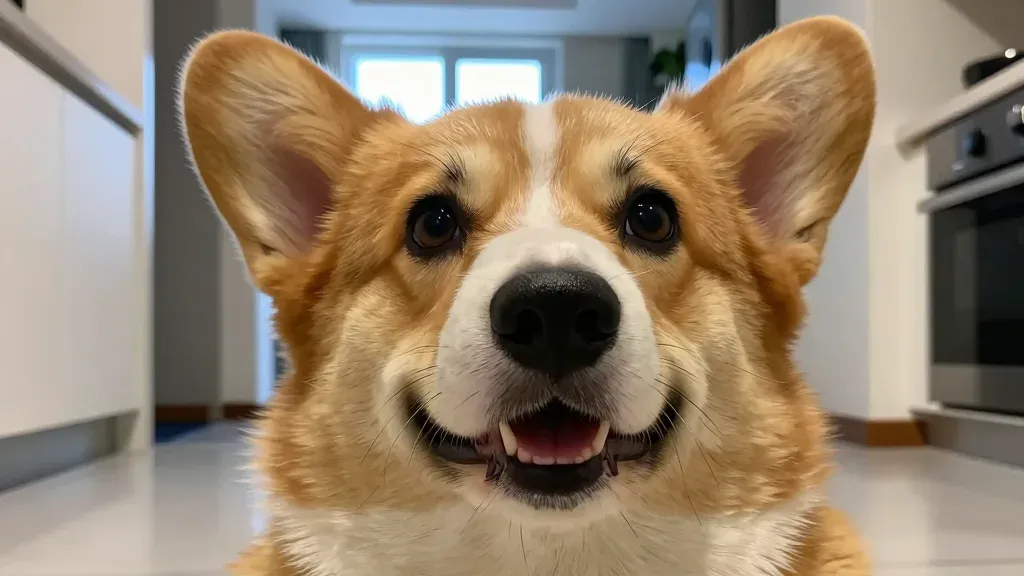 A Corgi with a playful smile and perked-up ears, showcasing glossy fur and soft, diffused lighting that creates a gentle glow. The close-up shot with a shallow depth of field blurs the background, emphasizing the dog's face and adding a cozy, intimate feel to the image.