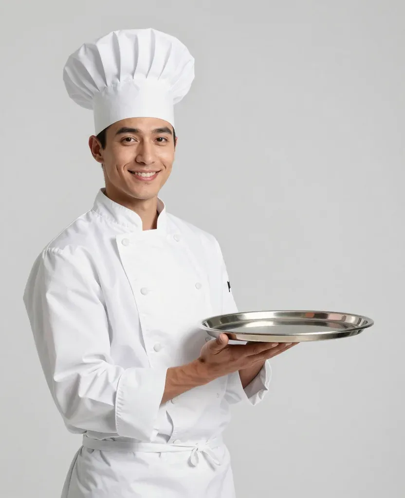 A chef in a crisp white uniform holds a reflective silver platter, illuminated by soft, diffused lighting that highlights the chef's features and the platter's polished surface. The neutral, blurred background ensures the chef and platter remain the focal points, creating a sense of anticipation and focus.