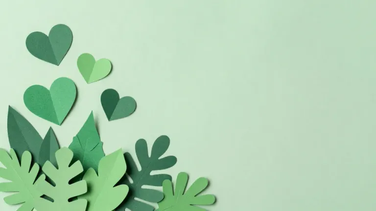 Glossy paper cutouts of hearts and leaves create a vibrant, asymmetrical arrangement against a soft, pastel green background. The diffused lighting highlights the texture and depth of the cutouts, enhancing their natural, organic feel.