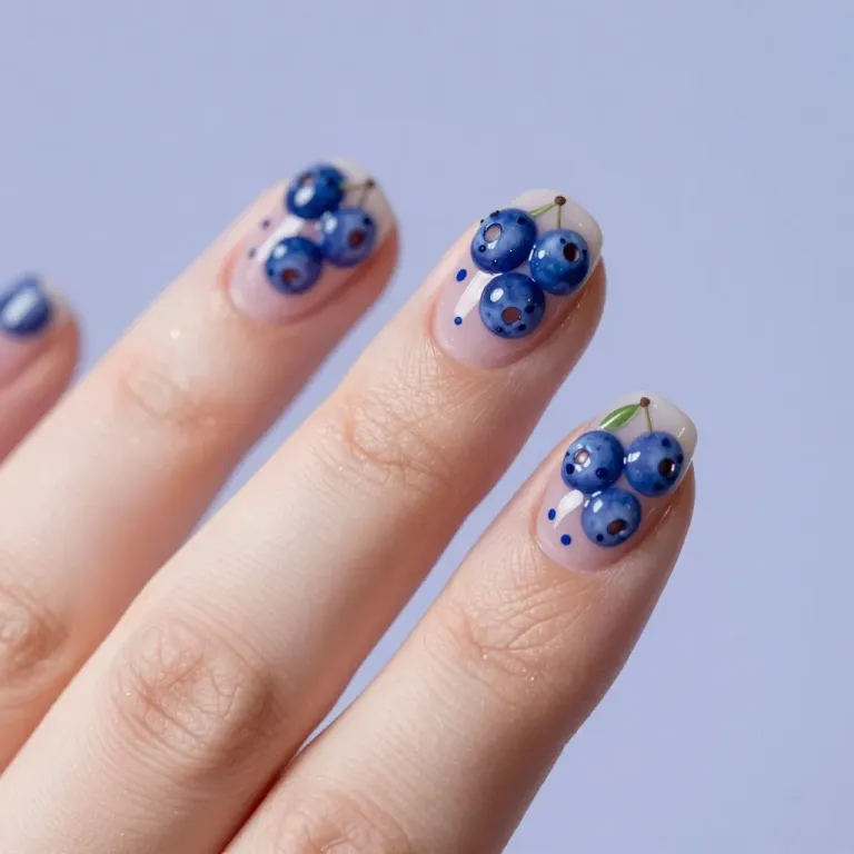 A close-up of a hand showcasing manicured nails with intricate blueberry cluster designs, featuring glossy, semi-transparent bases and fine white speckles mimicking berry texture. Soft diffused lighting creates highlights on the rounded berry shapes and nail tips, with a shallow depth of field isolating the subject against a smooth, out-of-focus lavender-gray background.